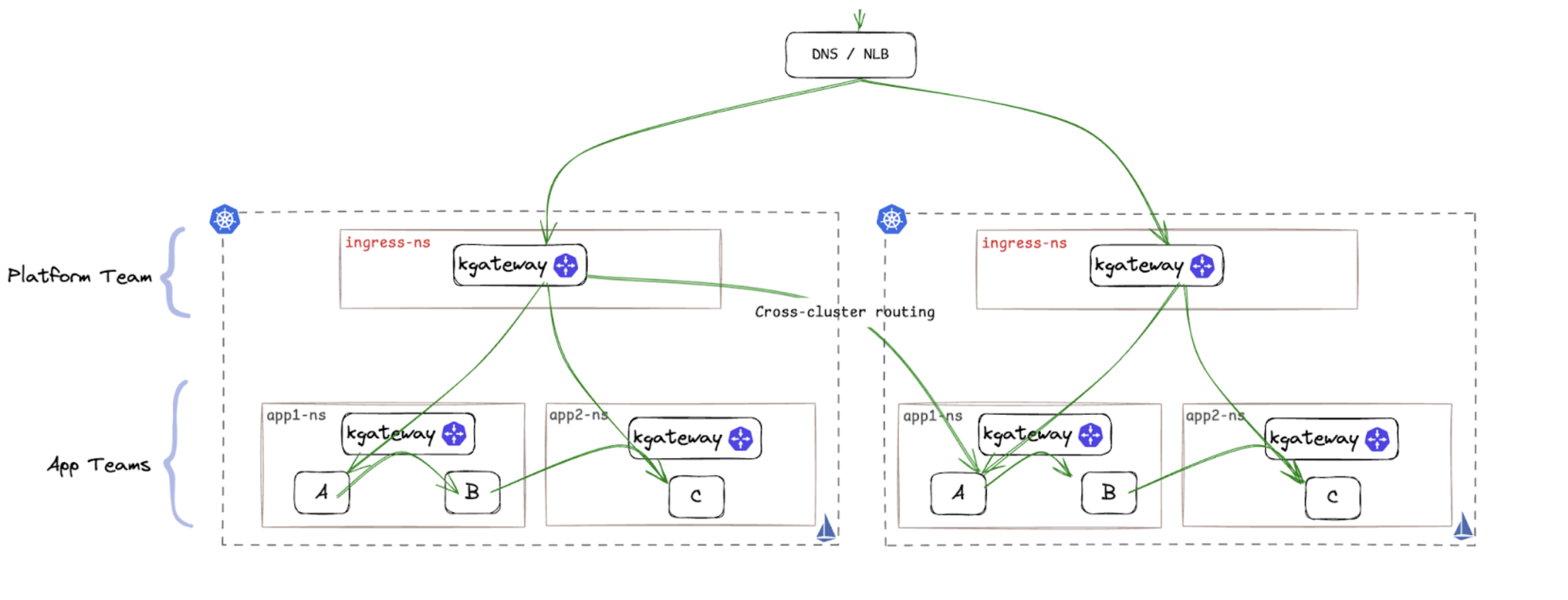 • Platform teams manage the main kgateway proxy for ingress traffic, applying global security policies and delegating routing to application teams (e.g., OpenID/OAuth authentication, JWT claims to headers, and global rate limiting).